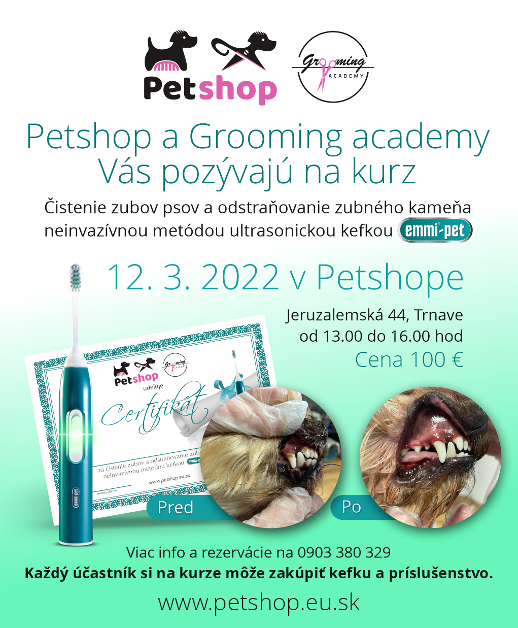 sonická kefka a čistenie zúbkov neinvazívnou metódou bez nutnosti uspania psíka. Na kurze si budeš môcť kefku a príslušenstvo i zakúpiť.